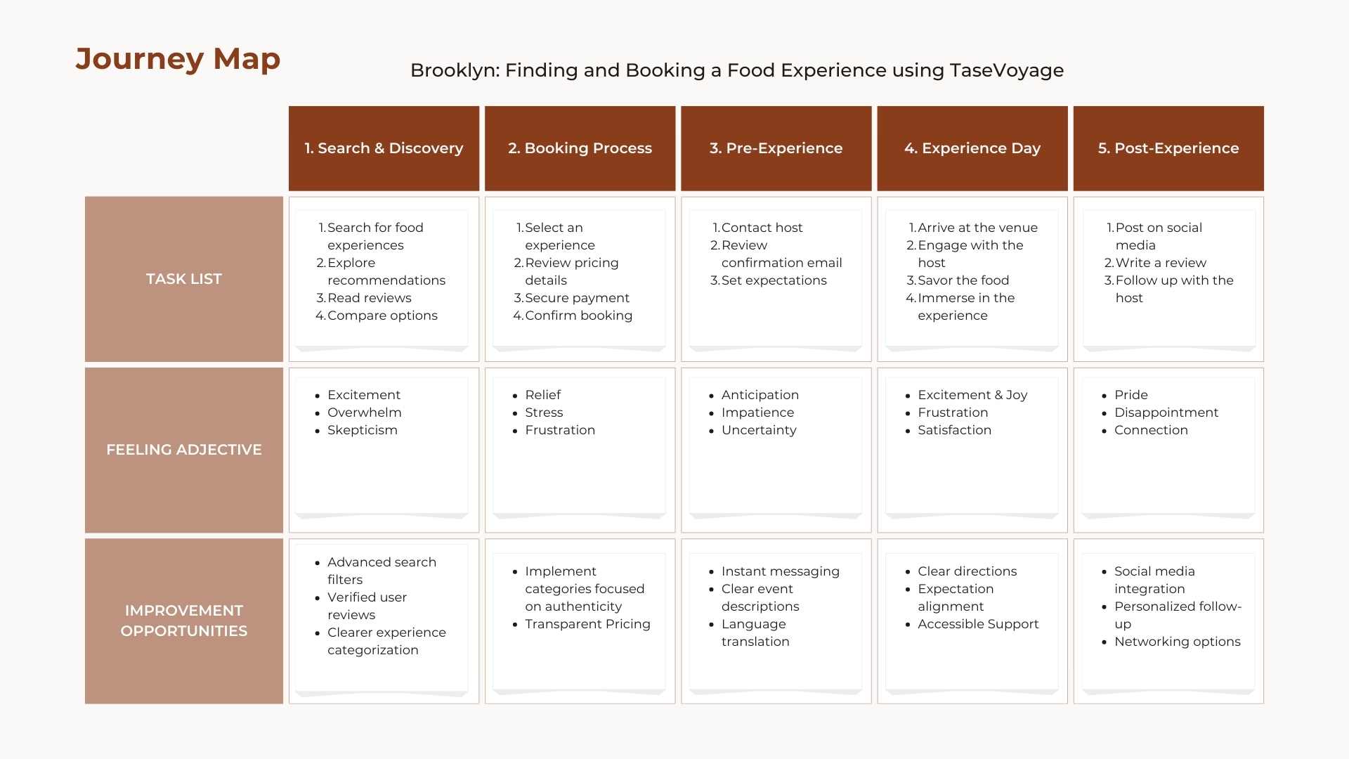 Before designing anything, I needed to understand what was getting in the way. A survey with 12 active travelers gave me data fast, and the answer pointed somewhere I didn’t expect. It wasn’t the price holding people back, it was anxiety over authenticity and language. Using that data alongside food tourism market research, I identified four primary personas: Bella (budget traveler), Brooklyn (immersive traveler), Ethan (family traveler), and Leo (luxury traveler). I then mapped the journey for each, identifying key pain points and improvement opportunities at every stage.