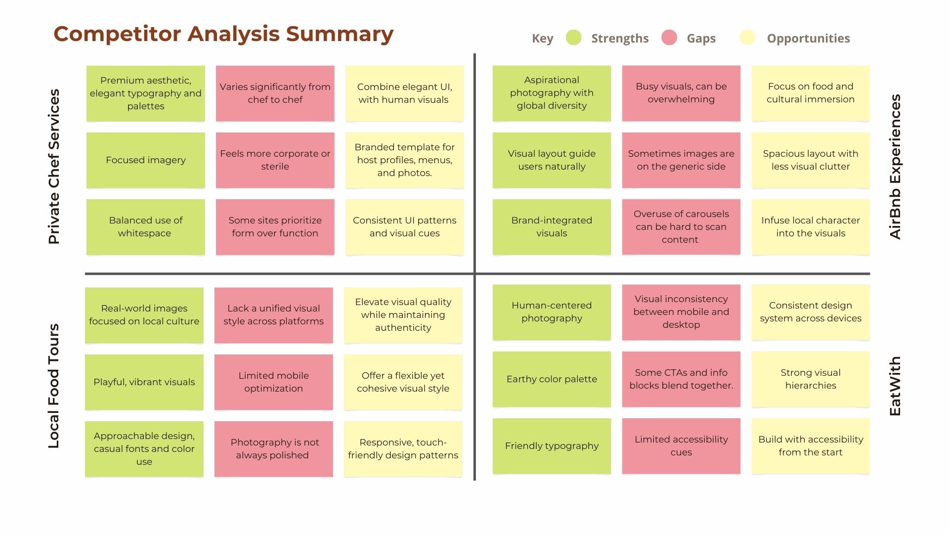 I analyzed four competitors – Private Chef Services, Airbnb Experiences, Local Food Tours, and EatWith – to see where the market was missing the mark. After looking at both the functional and visual gaps, the opportunity for TasteVoyage became clear: to bridge the space between exclusive private services and raw, local authenticity. My goal was to combine that accessibility of a global platform with the intimacy of community-led dining, creating a ‘boutique’ experience for explorers who want genuine cultural immersion without the tourist clichés.