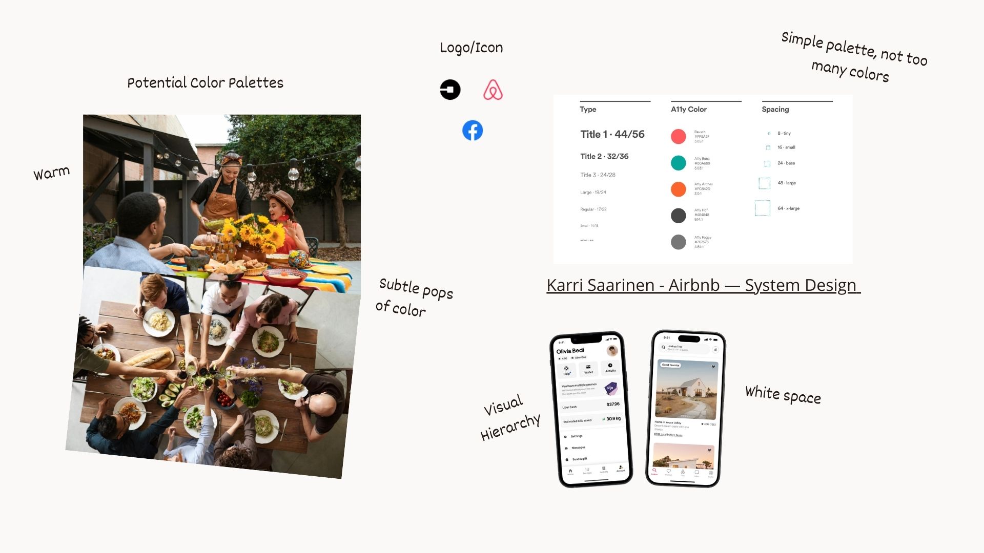 Discovery revealed three core principles: curation over volume, transparency builds trust, and aspiration & accessibility. Before wireframing, I established the brand foundation to ensure every UX decision reinforced the brand promise. I wanted the platform to feel like an extension of a dinner party, warm, inviting, centered on people. Colors were pulled directly from photography of shared meals. A quiet UI with generous white space ensures the app frames the community’s content rather than competing with it. I also moved away from generic icon libraries, redesigning each icon in Figma to match the brand’s specific geometry and weight. All colors were tested to WCAG 2.2 AA standards with a minimum 48x48 touch targets on mobile.