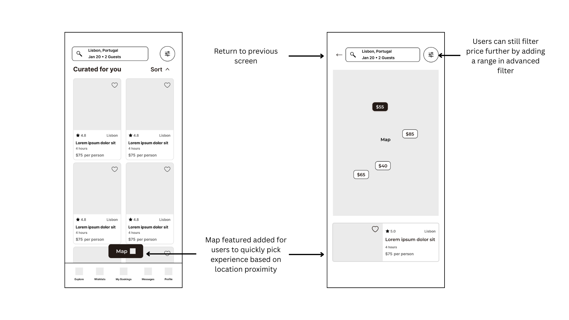 I began by sketching layouts for the entire user journey before moving into low-fidelity wireframes in Figma. During my first usability study with six participants, I quickly realized that I was overwhelming them with too much at once, which led to fairly generalized feedback. Drawing from my teaching background, I decided to scaffold the process and narrow the scope strictly to the Search & Discovery. This pivot allowed for two rounds of targeted insights. Round 1 showed that sorting options were buried, and text-based locations felt disconnected; by Round 2, I confirmed that a map toggle and one-tap sorting directly resolved these hurdles, helping users make faster, more confident decisions.