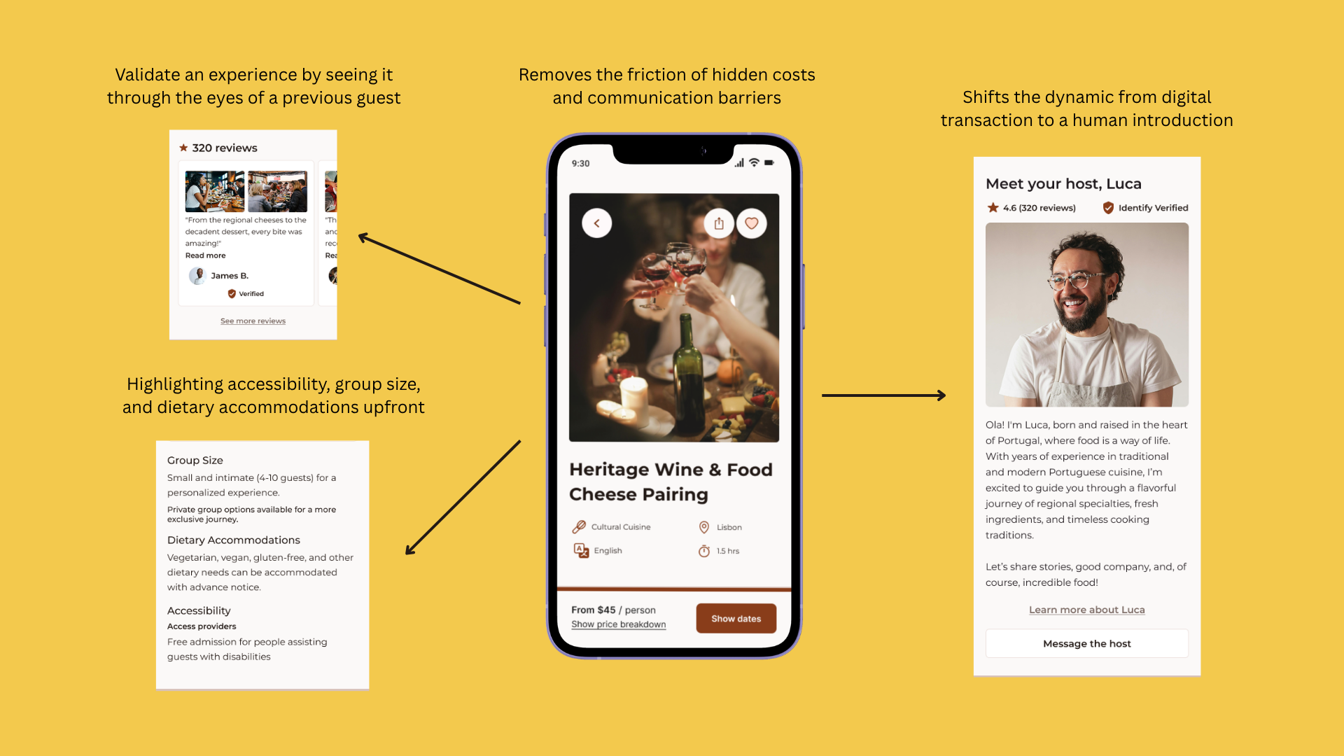 Research pointed to one recurring theme: travelers don't just want a great meal, they want the confidence to say "yes". The experience page layers in language tags, precise locations, and a full price breakdown to remove friction before it arises. Verified badges, video host intros, and direct messaging transform a faceless booking into a connection with a real person to turn a stranger into a trusted guide before the traveler has even committed.