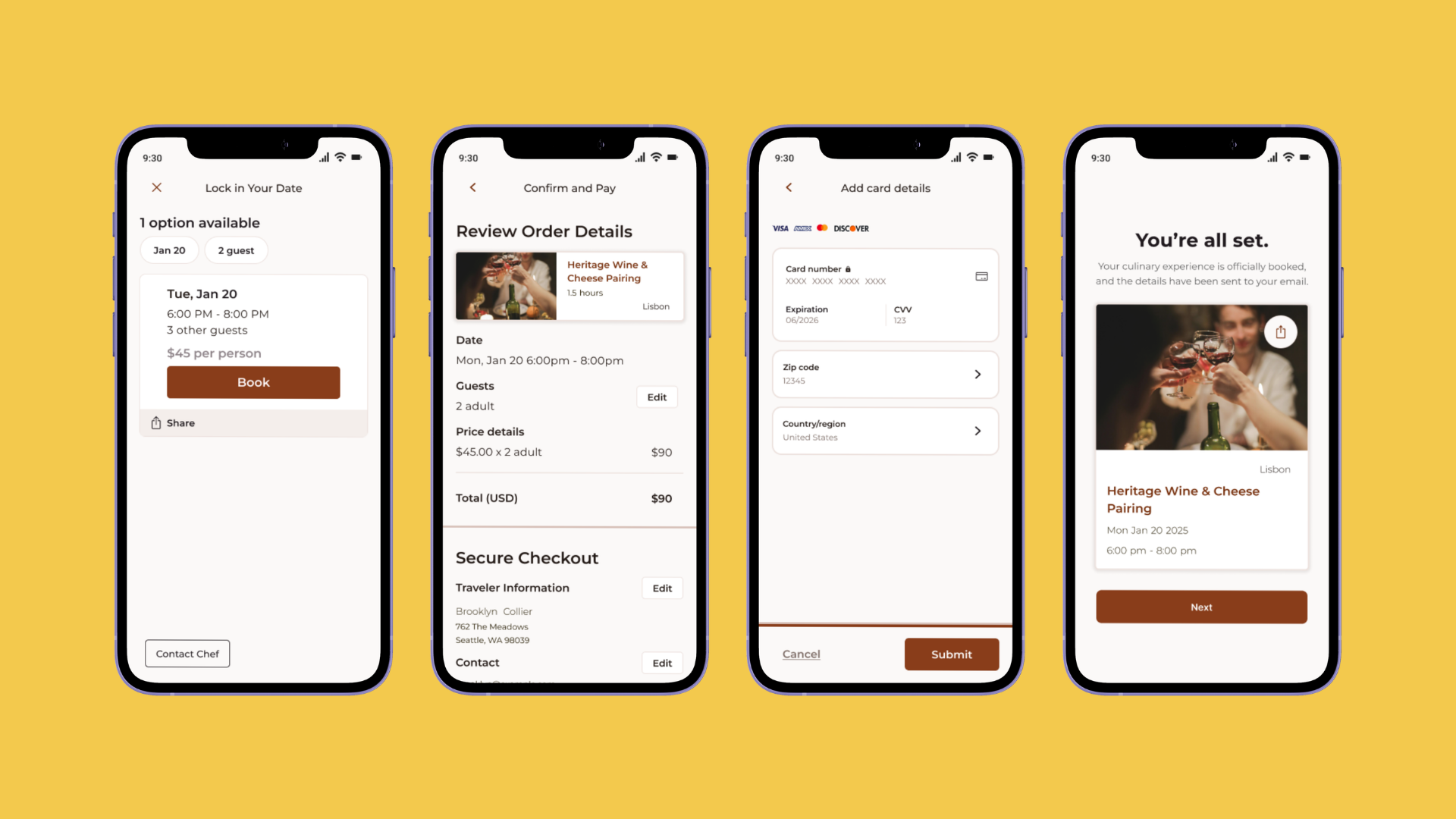 Once at the point of highest intent, the booking flow gets out of the way. Availability surfaces at a glance, a full order summary appears before payment, and the confirmation is warm and immediate. The result is a streamlined two-minute journey that replaces uncertainty with clarity.
