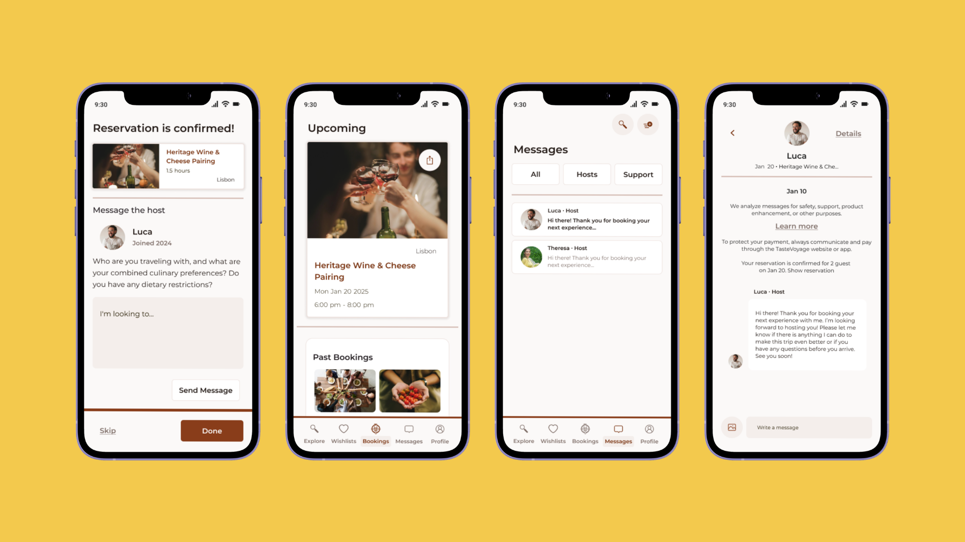 The experience doesn't just stop at checkout; it begins there. Travelers are immediately connected to their host and prompted to share dietary restrictions and preferences, so personalization starts before arrival. The booking hub keeps everything in one place, with host messages deliberately separated from general support so the personal connection never gets buried. This post-booking layer was the gap in every competitor analyzed, and the feature most likely to turn a one-time traveler into a returning user.