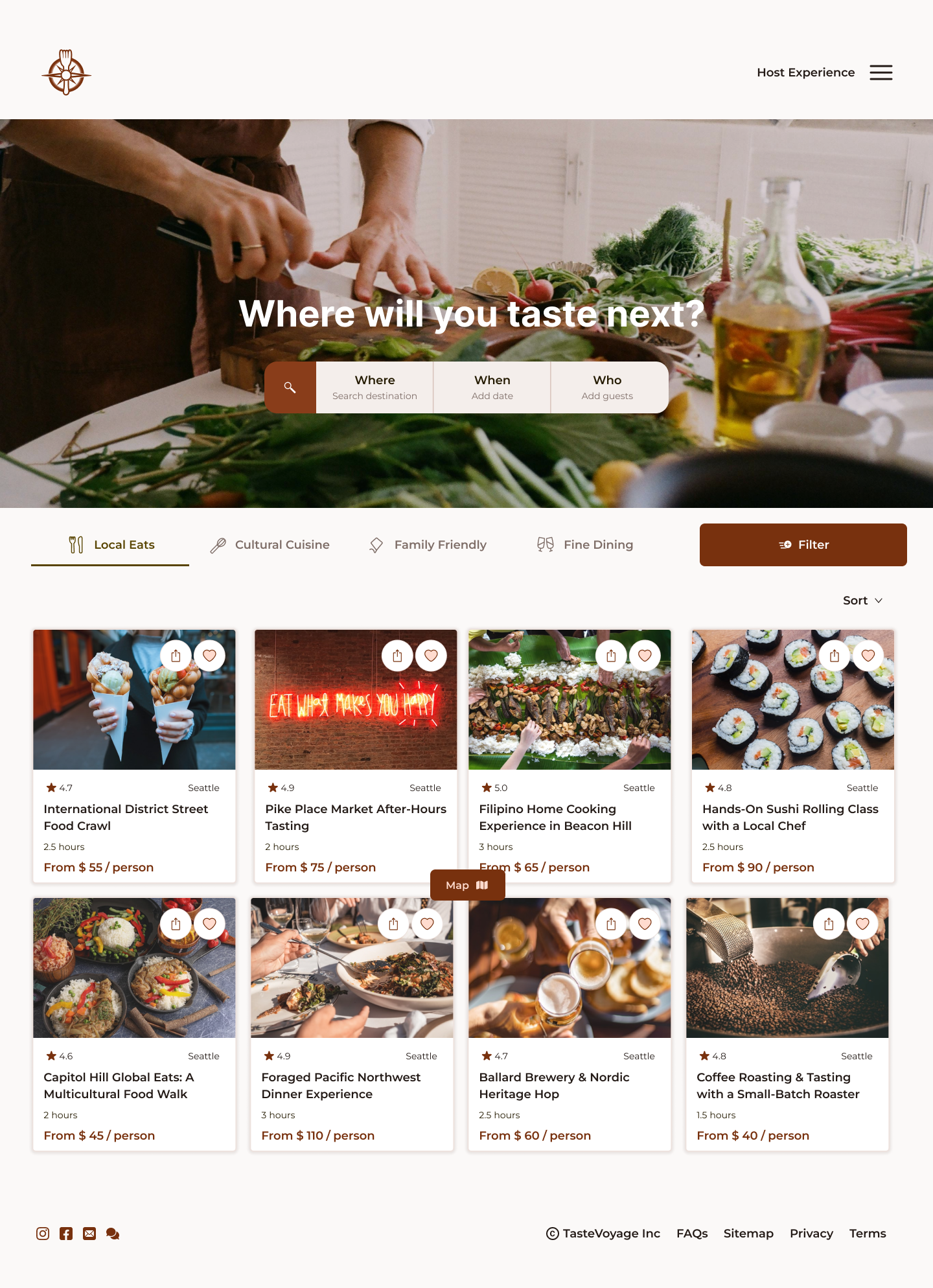While TasteVoyage was designed mobile-first, a significant portion of travel bookings happens on desktop. I explored how the experience would scale, using the expanded grid to surface more options at a glance, and bringing filter controls forward so desktop users can refine without extra navigation steps.